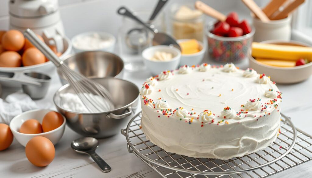 Choosing the right ingredients is key to baking a great cake. High-quality items like all-purpose flour, granulated sugar, and unsalted butter are essential. For oven-baked cakes, the type of flour used is critical. It impacts the cake’s texture and structure.