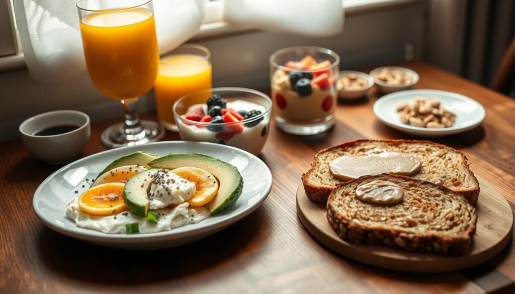 Other great choices include Greek yogurt with nuts and seeds. Or, a breakfast bowl with eggs, avocado, and whole-grain toast.
