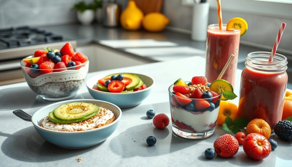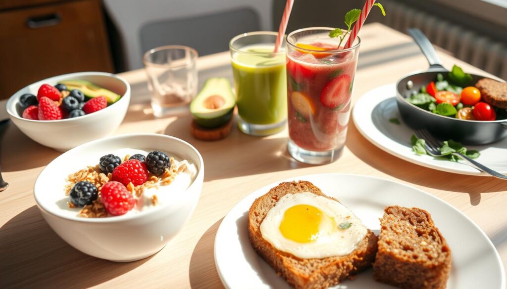 For lunch and dinner, there are many protein-rich meals. Try a Greek yogurt parfait with fruits and nuts. Or, a salmon salad for lean protein and omega-3s.